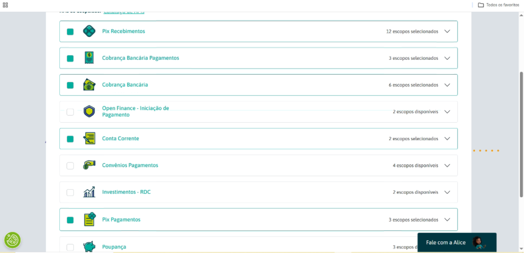 Selecione o Sicoob e clique em API.