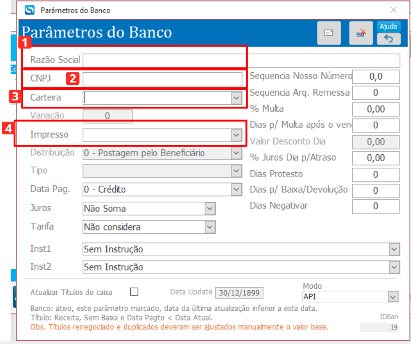 Configure o banco com as seguintes informações: Agência, N° da conta e o Código Cedente, caso não tenha essas informações solicite ao seu gerente do banco.