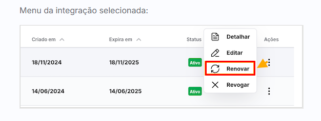Selecione uma integração ATIVA com data de expiração igual ou inferior a 90 dias.