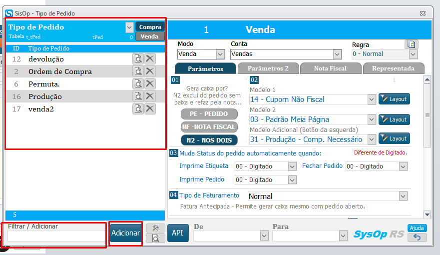 No campo Filtrar/Adicionar digite o nome que você deseja para o novo tipo de pedido, clique em adicionar e pronto ele já estará na sua lista.