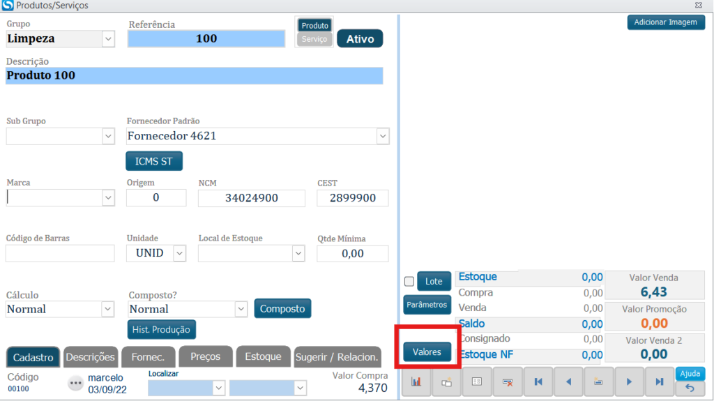 Abra o produto e clique no botao Valores