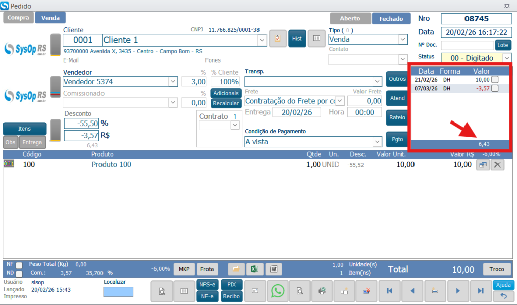 Note que o valor de venda do produto é R$ 6,43, ao digitar o pedido, vendi ele por R$10,00