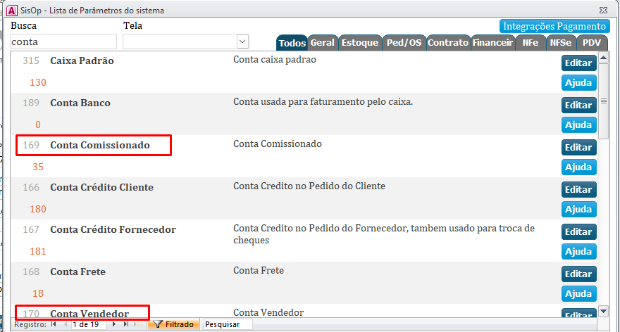 Pesquise por 170 para “Conta vendedor” e 169 para “Conta comissionado”