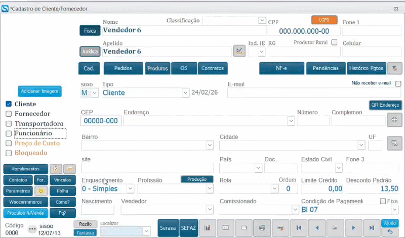 Neste cadastro de cliente foi feito o cadastro de um vendedor, e colocado no grupo Vendedores e marcado o checkbox Funcionário