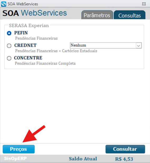 Caso queira saber o valor das consultas para saber quanto irá descontar do seu saldo clique no botão Preços.