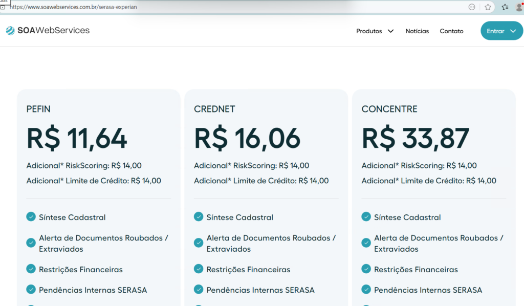 Para conseguir consultar pelo Serasa precisa estar cadastrado no SOA, caso não tenha criado cadastro no SOA para conseguir consultar clique no Link abaixo: https://sisop.com.br/criar-cadastro-soa-webservice-para-realizar-consultas-serasa/