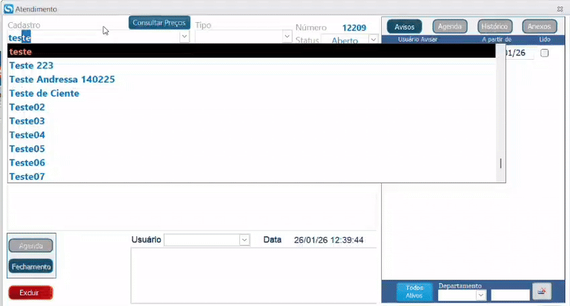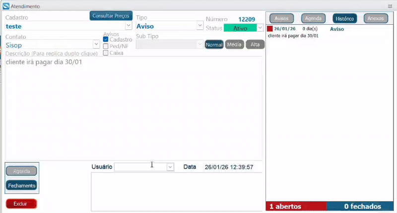Ao lançar um atendimento, seu status ficará como “Aberto”, para fechá-lo acesse Consultas> Atendimentos: