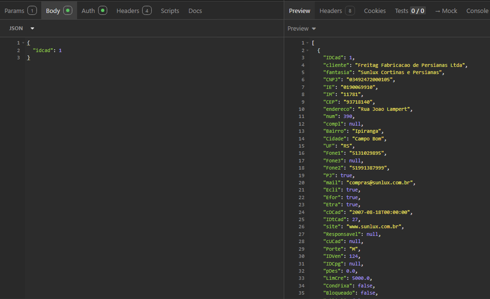 { "IDCad": 1 }O que você recebe: Uma ficha completa com mais de 40 campos, incluindo todas as informações pertinentes ao cadastro da revenda.