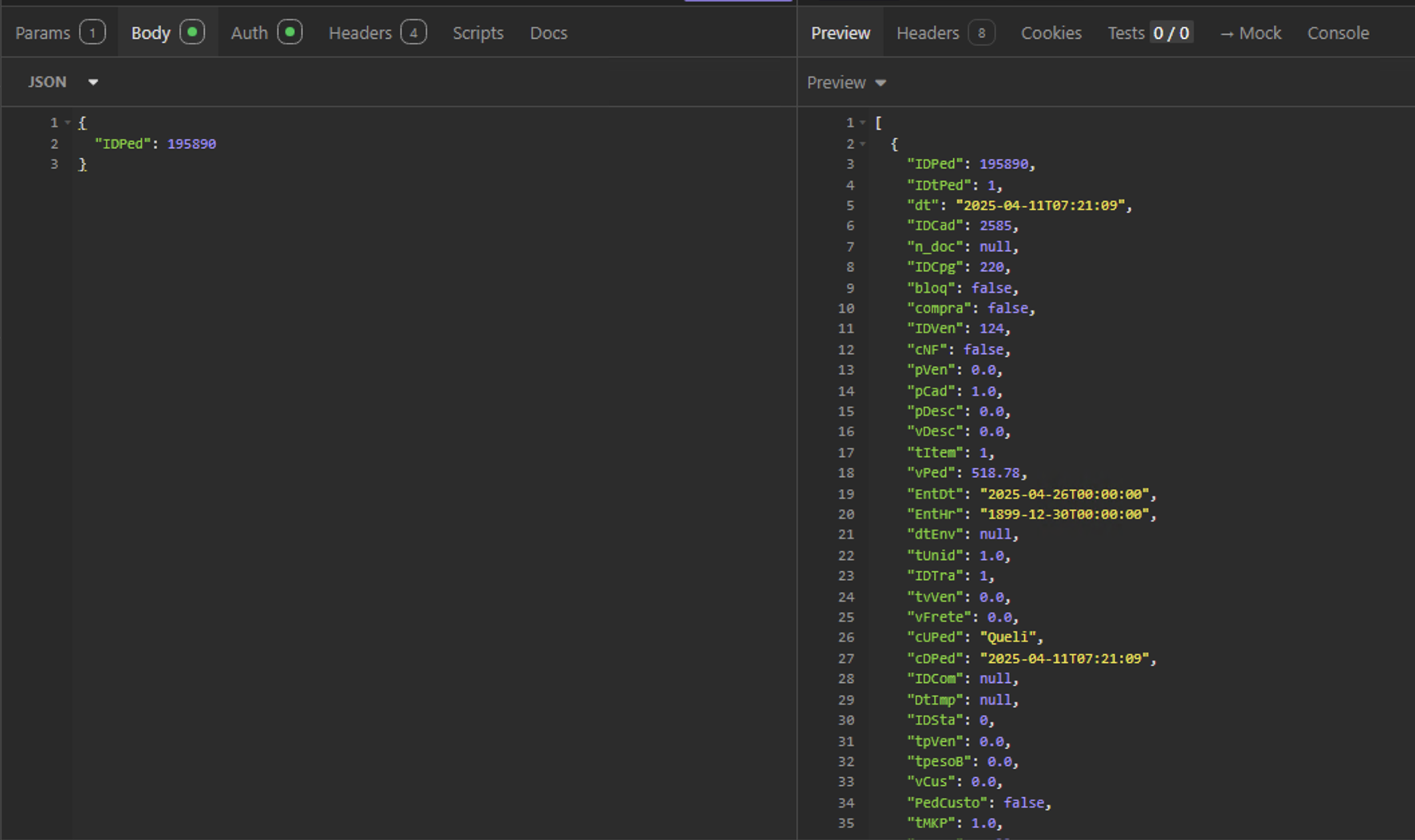 { "IDPed": 195890 }O que você recebe: Todas as informações pertinentes ao pedido. Dentro de cada pedido, você verá detalhes dos produtos inclusos e dentro dos produtos verá todas as informações pertinentes às opções.