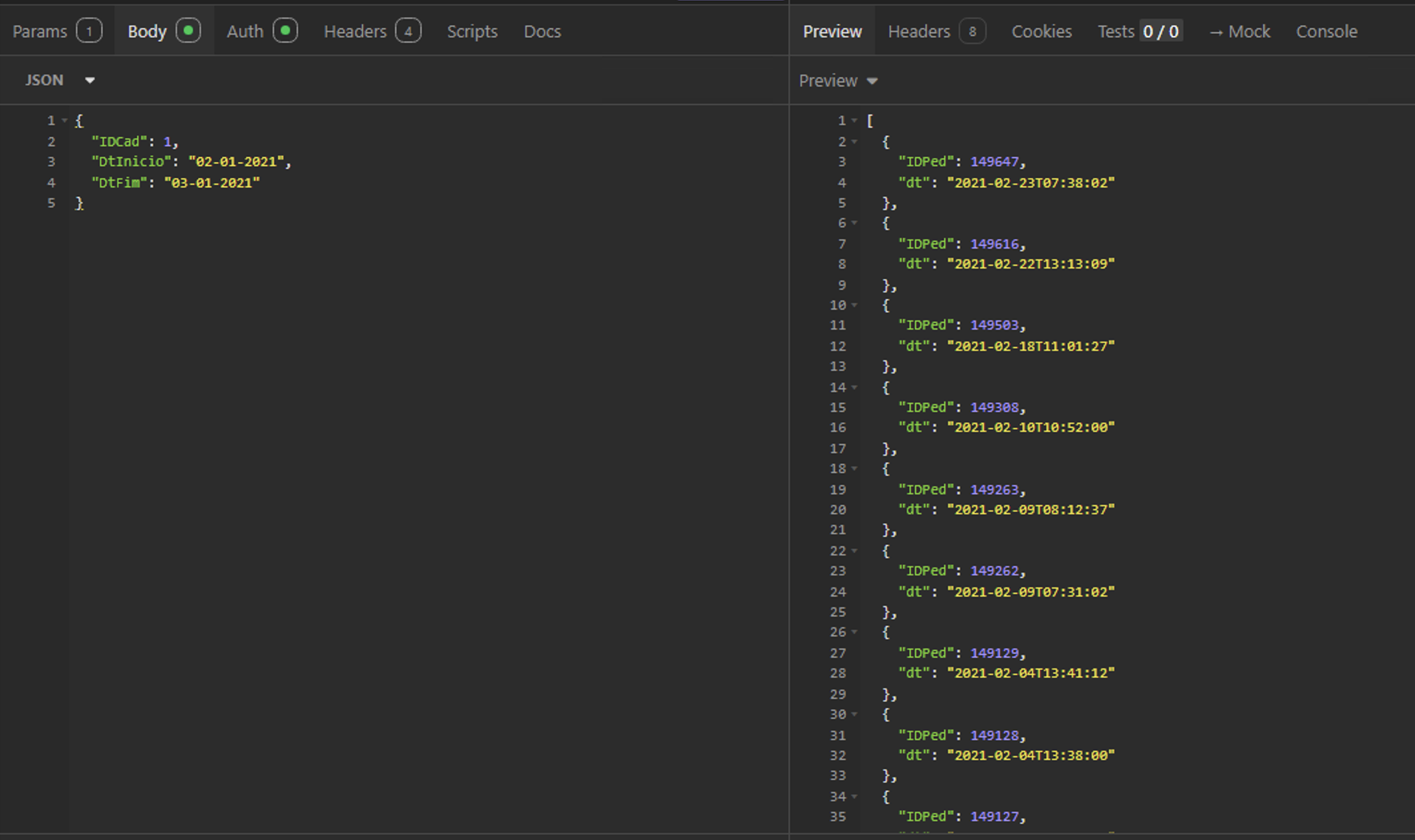 { "IDCad": 1, "DtInicio": "02-01-2021", "DtFim": "03-01-2021" }O que você recebe: Uma lista contendo os IDs dos últimos 50 pedidos e as datas em que ocorreram dentro do filtro informado.