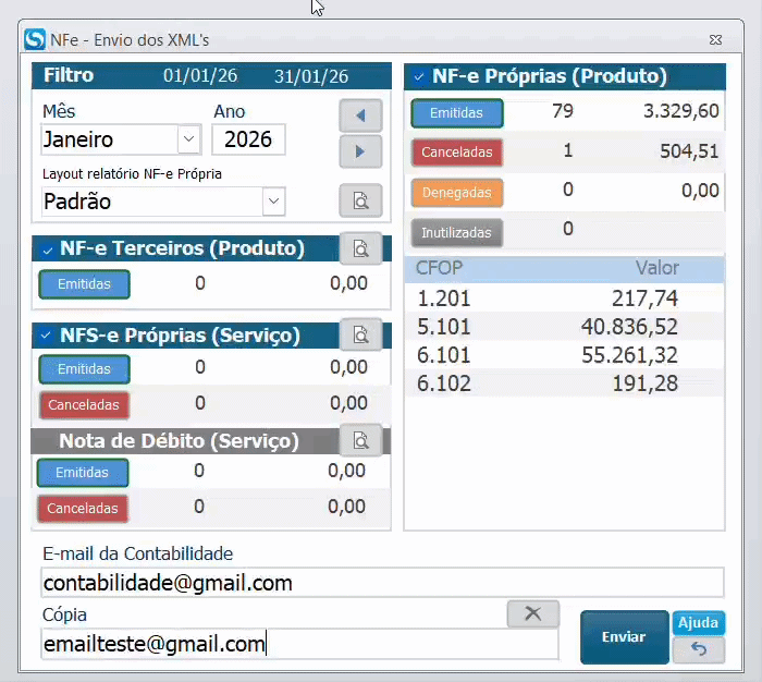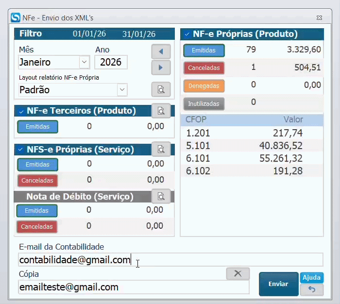 Digite o E-mail da Contabilidade, caso desejar, preencha também, um e-mail para receber uma cópia do envio.