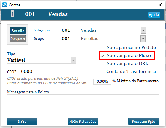 Selecione a Conta que não aparecerá no fluxo de caixa, no exemplo usamos Vendas Marque o checkbox “Não vai para o fluxo”: