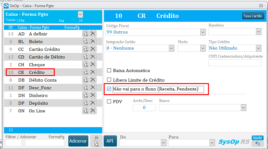 Selecione a Forma que não aparecerá no fluxo de caixa, no exemplo utilizamos CR Crédito.