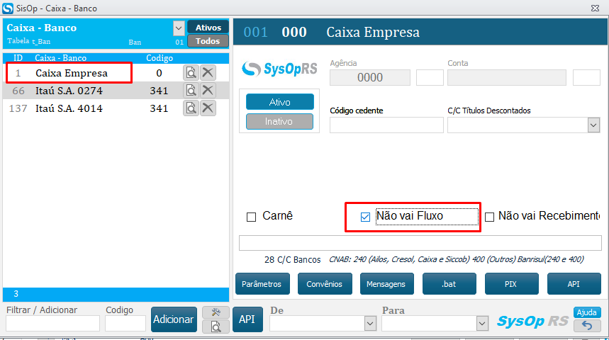 Caso desejar que algum “Banco” não vá para o painel de fluxo, acesse: Cadastros> Bancos: