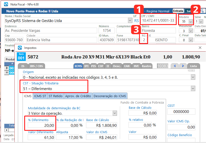 2 Passo: procure pelo parâmetro ICMS % Diferido e adicione o valor desejado, no exemplo abaixo utilizamos 20.