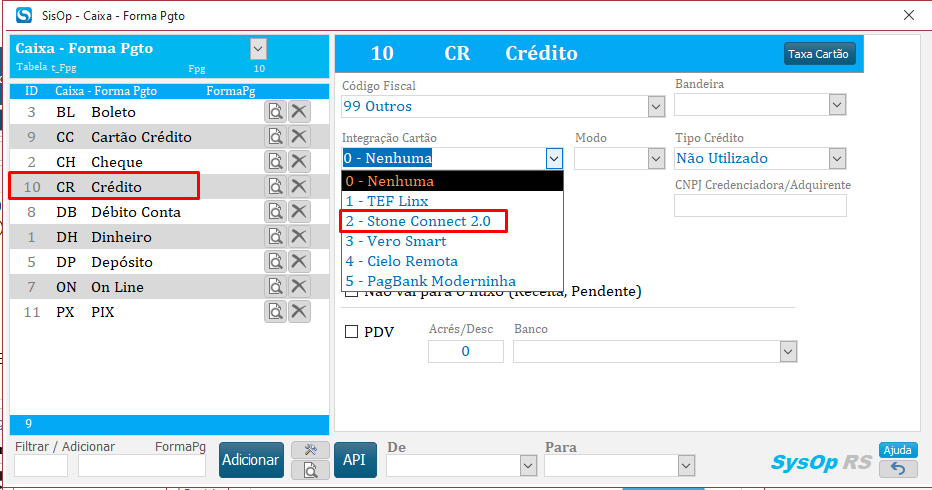 Em Integração Cartão selecione a opção 2 – Stone Connect 2.0.